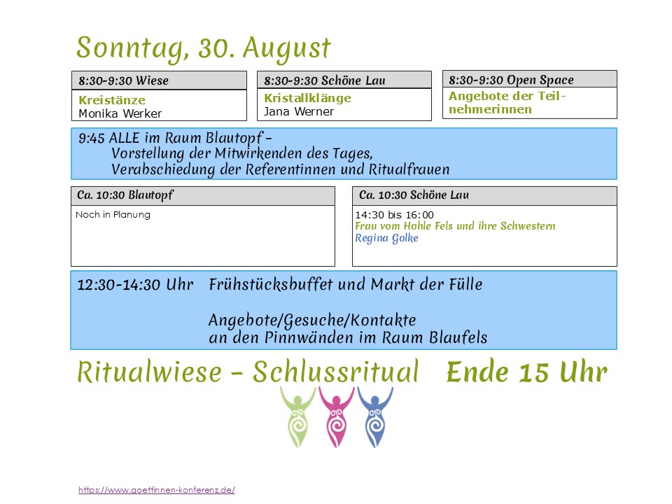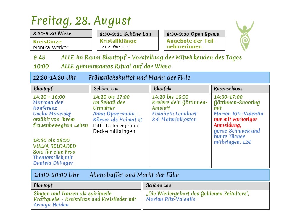 und Göttinnenlieder, Kreistanz, Workshops, Vorträge, Theater …
