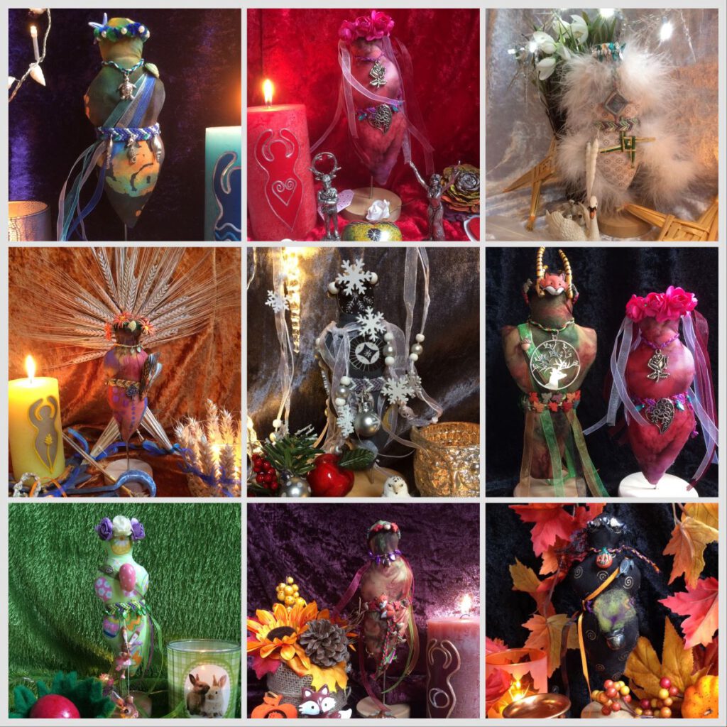 Ich erschaffe Göttinnen aus vielerlei Materialien (Wolle,Stoff,Holz,Modeliermasse,Perle..uvm) Die Kleinsten als Gaben für die Natur ..bis zu Reisegöttinnen für Kreismitten und Altäre.Für mich ist immer noch jede Einzelne die entsteht meine Art von „Göttinnendienst“ und jede die mit Euch in die Welt zieht ein wundervolles Geschenk für die Göttin und für mich