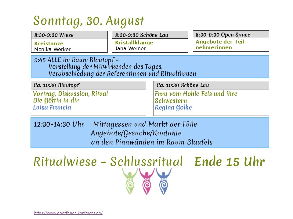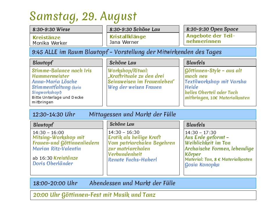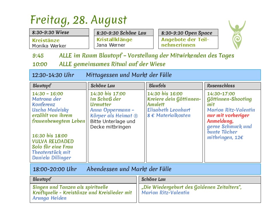 und Göttinnenlieder, Kreistanz, Workshops, Vorträge, Theater …